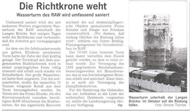Die Richtkrone weht auf dem Wasserturm des RAW